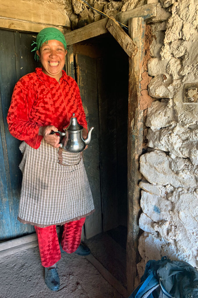 Aziza twijfelde een moment, maar zei toen: “Mijn huisje is daar” en wees omhoog naar de rand van de heuvel. “Ik ga thee maken. Haal jij je groep op en wees welkom in mijn huis.” Even later stond Aziza glunderend met de theepot in haar hand naar de toeristen te kijken, die waren neergestreken op de tapijten in de kamer en genoten van de thee en het warme brood met olijfolie.